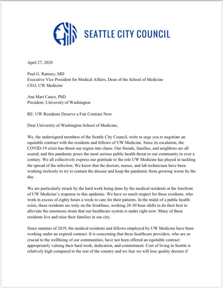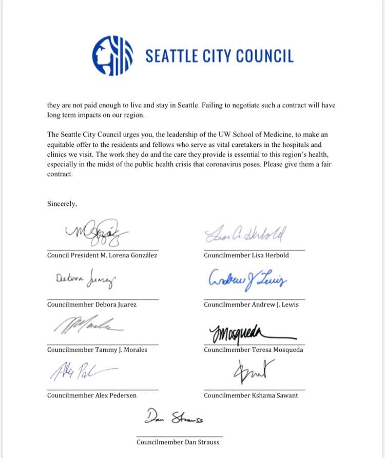 On April 27th, all nine Seattle City Councilmembers signed a letter of support on behalf of residents and fellows at the University of Washington receiving a fair contract.