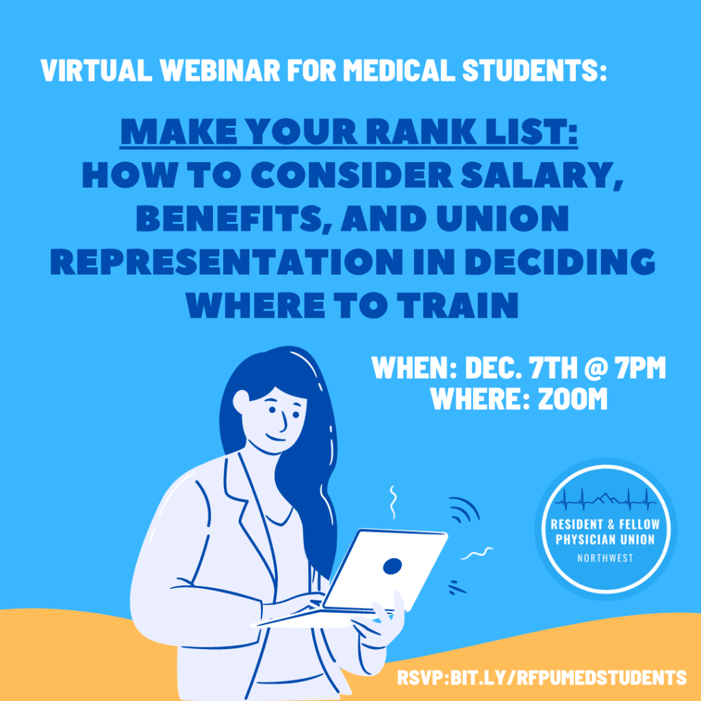 Join members of our RFPU – NW executive board and staff for our second annual, “Make Your Rank List: How to Consider Salary, Benefits, and Union Representation in Deciding Where to Train” webinar and Q&A on Monday, December 7th at 7:00pm!