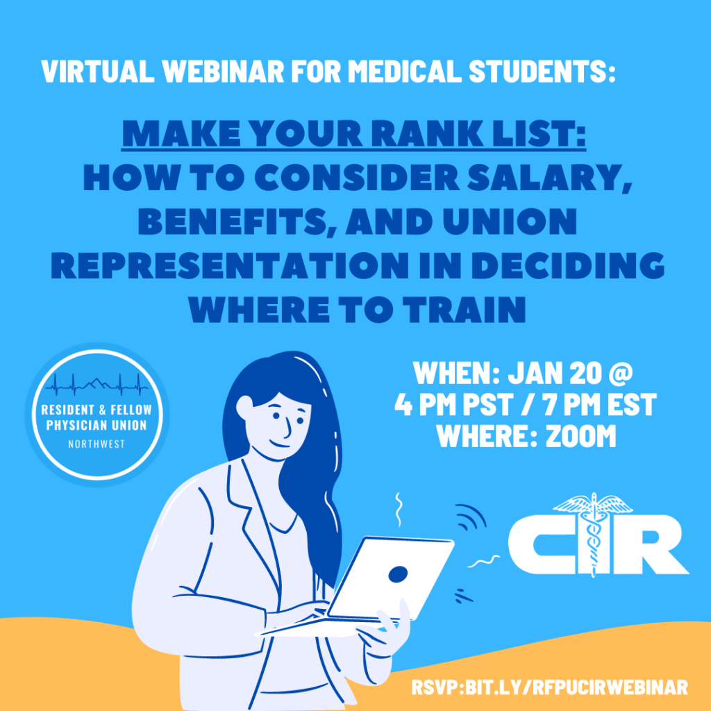Join CIR and RFPU – NW for, “Make Your Own Rank List: How to Consider Salary, Benefits, and Union Representation in Deciding Where to Train”