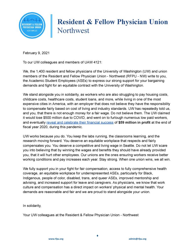 ASEs at UW will begin bargaining their next contract with our mutual employer soon. Our union shares our solidarity with these UAW 4121 members in their fight for a fair contract. The below letter was presented to UAW 4121 members at their membership meeting.