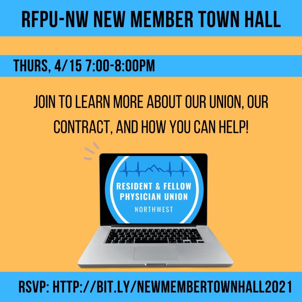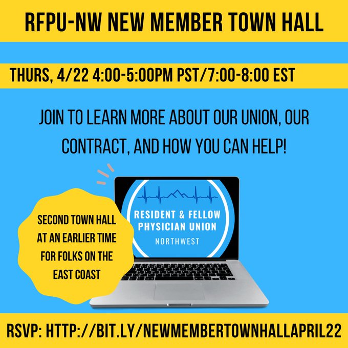 - Join one of our New Member Town Halls to learn more about our union! Open to everyone! There will be one on April 15th (7pm PT) and one on April 22nd (4pm PT)!
