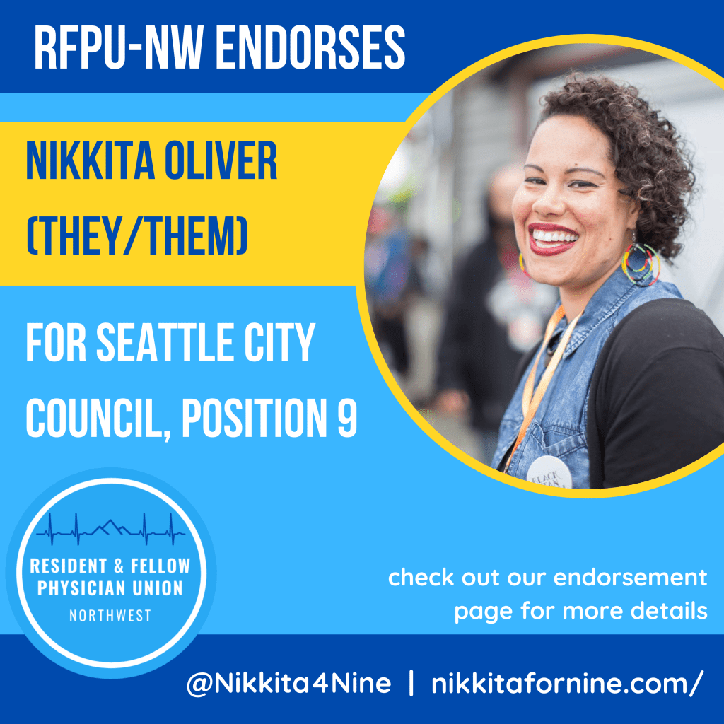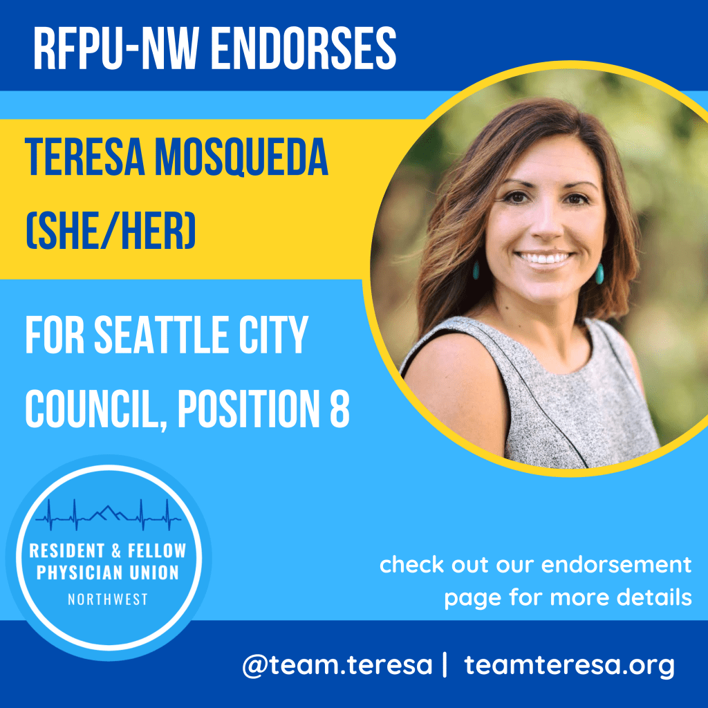 RFPU – NW is honored to endorse incumbent Councilmember Teresa Mosqueda for re-election. CM Mosqueda (she/her) currently serves in this at-large seat, an office she has held since 2017. CM Mosqueda has succeeded in many large accomplishments in her short time on the Council, including championing the country’s first Domestic Workers Bill of Rights, and most recently leading the passage of JumpStart Seattle – a progressive revenue plan and COVID relief bill that brings in $214M/year to fund affordable housing, equitable development, and green new deal programs that invest in small businesses and our most vulnerable workers. CM Mosqueda has also been a healthcare champion for not only our city, but also our state – having served on the WA Affordable Care Act Exchange Board where she fought for healthcare access for working families, women, people of color, immigrants, and the lowest wage individuals. In addition to her nearly decade long experience working for the state labor council, we are confident CM Mosqueda will continue to fight for all residents and workers in Seattle – and we’re thankful for her past support in our fight for a fair contract (see the video she made for US in our last round of bargaining!) against UW.