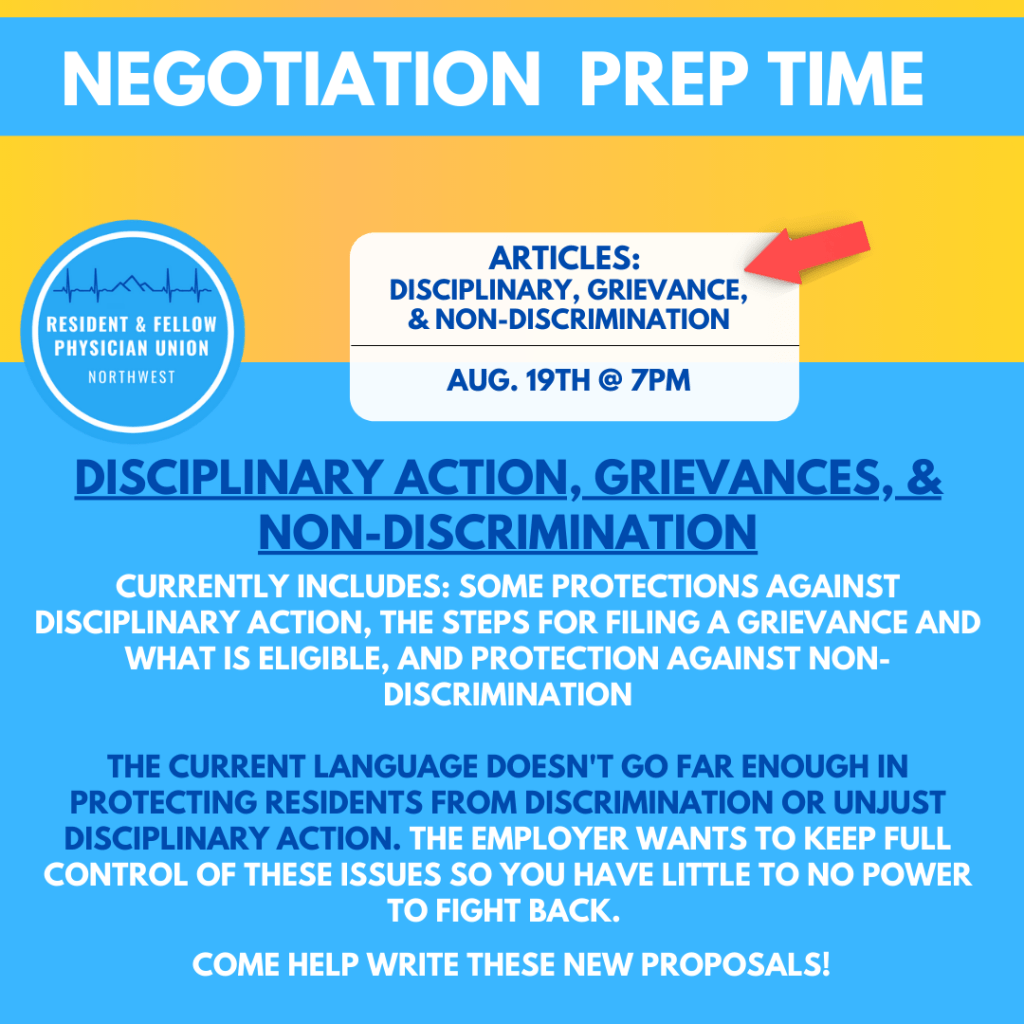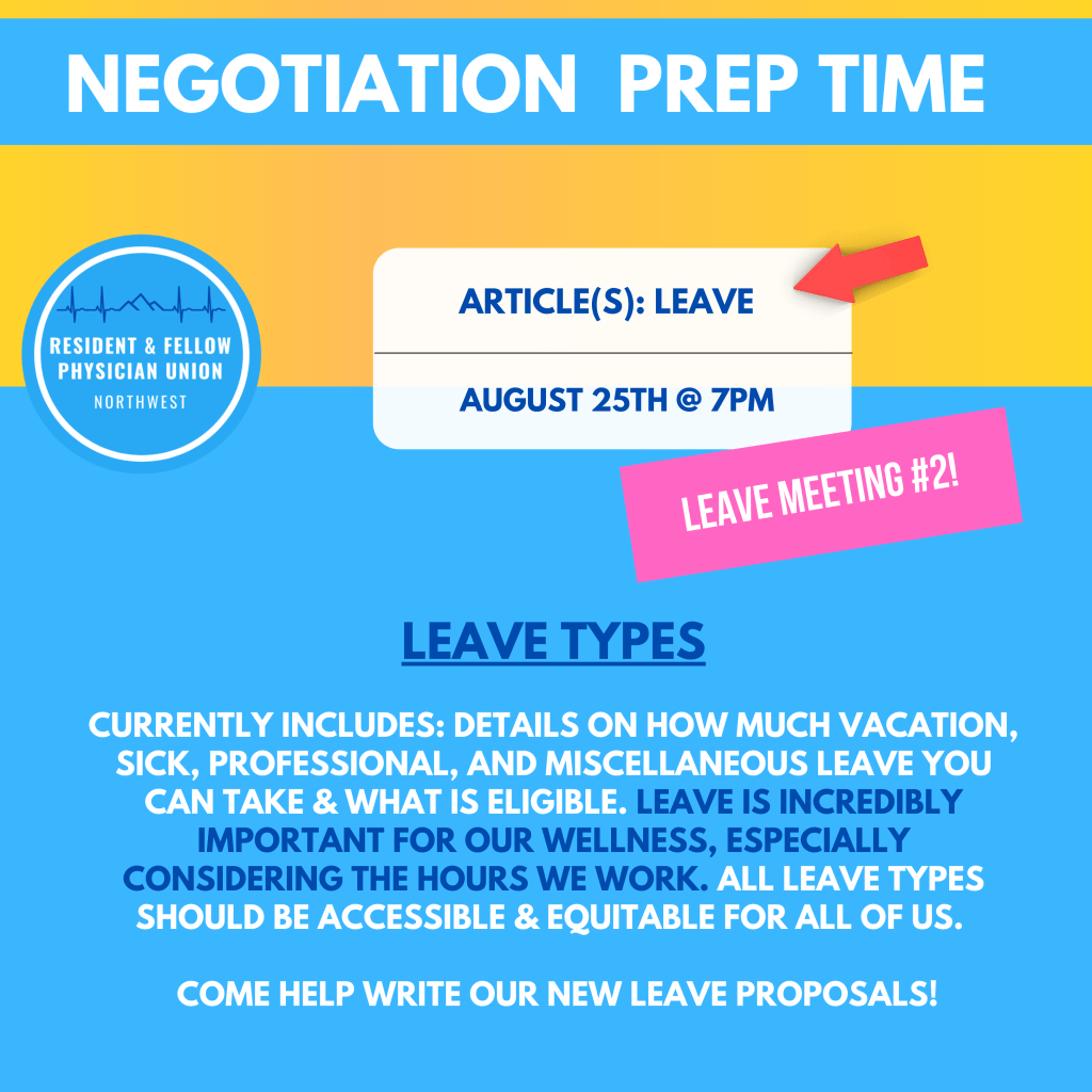 8/16: REGISTER HERE FOR FRINGE BENEFITS MEETING 8/19: REGISTER HERE FOR DISCIPLINARY, GRIEVANCES, & NON-DISCRIMINATION MEETING 8/25: REGISTER HERE FOR LEAVE MEETING #2 8/30: register here for Working Outside the Training Program (Moonlighting), Professional Development & Licensing 9/9: Register here for vacation & sick leave 9/9: register here for Dues Deduction & Membership, Union Activities 9/13: register here for Health & Safety, No Strikes, No Lockouts, Duration 9/21: register here for Scheduling and Hours, Management Rights, Subordination of Agreement and Authority 9/27: register here for Definitions, Committee Memberships and Hospital Committee, Housestaff Advisory Committee Share on: Click to share on WhatsApp (Opens in new window) WhatsApp Click to share on Facebook (Opens in new window) Facebook Related Published by RFPU View all posts by RFPU